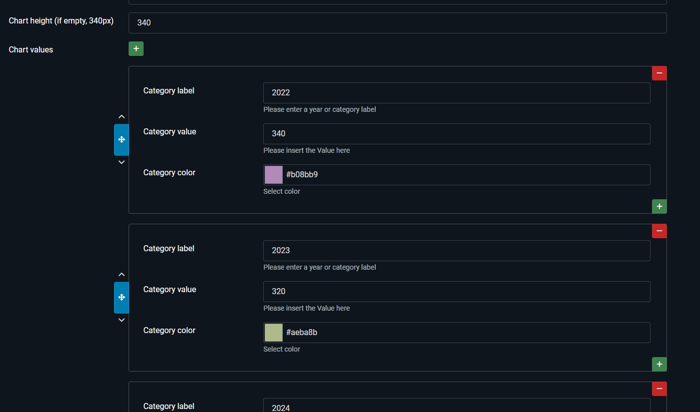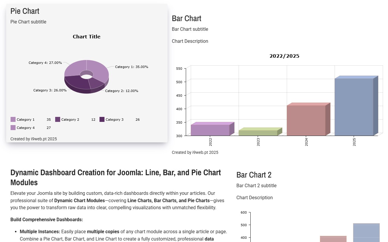 - Multiple Instances: Easily place multiple copies of any chart module across a single article or page. Combine a Pie Chart, Bar Chart, and Line Chart to create a fully customized, professional data dashboard.