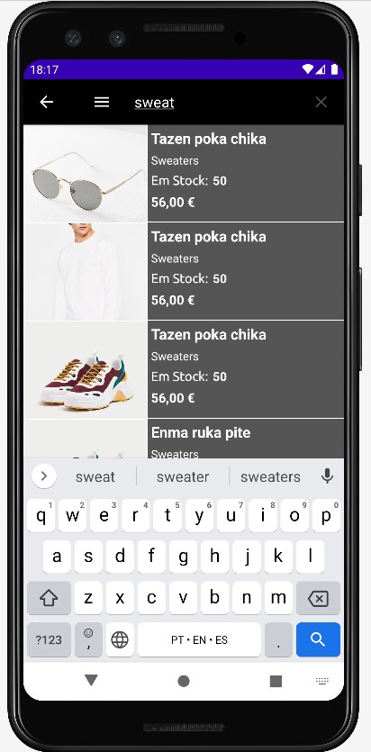 The project uses an activity_shop.xml layout with RecyclerView and fully supports filtering/searching products based on name, studio, description, or category.